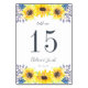 Las tarjetas de número de la tabla de moda de campo cuentan con grupos de girasoles color amarillo, hojas verdes y pequeños brotes azul marino, enmarcando el número de la mesa en gris azulado ahumado. Personalice con sus nombres y fecha de boda, o asigne un nombre a cada mesa para que tenga un toque personal adicional. El diseño se repite al revés. Se coordina con nuestra suite de invitados de boda floral Flowerfields.