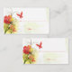 Esta elegante tarjeta de visita para bodas de moda tiene un diseño floral de color rojo y verde con dos mariposas volando a la izquierda. En la parte inferior hay una silueta gris y suave de flores de nenúfares. En el fondo, se respira un suave aspecto verde angustiado. A la derecha, puedes escribir en casa el nombre del invitado y el número de la tabla en la que se encuentran.