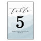Elegantes tarjetas de mesa de bodas con fondo azul acuarela con una fuente caligráfica con letras a mano. Personalice las elegantes tarjetas de número de tabla con su nombre y fecha de boda para obtener un aspecto personalizado.
