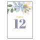 Estas tarjetas de números de mesa boda de personalizable presentan elementos florales de color agua elegantes en diversos tonos de violetas polvorientas y dorados con hojas verdes.