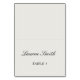 Tarjetas de lugar de boda clásicas y elegantes con el nombre del invitado personalizado y número de mesa en un fondo beige moderno.