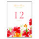 Boda de la plantilla de la tarjeta del número de la mesa con un tema tropical retro con ilustracion de flores de hibisco coloridas sobre rojo brillante, naranja y verde. Adecuado para el verano / ceremonias hawaianas / al aire libre / jardín u otros bodas tropicales o exóticos. Personalízalo con tu propio texto o personalizar si necesitas editar el diseño y el color. También hay disponibles invitaciones para bodas coincidentes y otros productos.