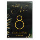 INSTRUCCIONES DE TARJETAS DE TABLA: Cree una tarjeta de número de tabla, para cada tabla, una a la vez, y agréguela a su carrito, una a la vez. Haga esto por tantas tarjetas de mesa como sea necesario. Edite el número de tabla siguiente (actualiza ambos lados) y colóquelo en su carrito. Para volver a esta página de producto desde el carrito, haga clic en el enlace de nombre de producto azul para continuar agregando tarjetas a su carrito. ¿Necesitas ayuda? Envía un mensaje o envíame una charla. Una elegante invitación a una boda tropical pintada con acuarela pintada con un impresionante lavabo de acuarela negra con hojas de palma verdes pintadas de manera exquisita y acentos dorados brillantes. Una animada caligrafía de guión de swash dorado anuncia los detalles de su boda.