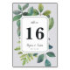 Las elegantes tarjetas botánicas de número de tabla cuentan con rociadores de hojas de acuarela de estilo vintage verde que rodean el número de la tabla, la fecha del evento y el texto personalizado adicional. El color de fondo es suave, gris paloma pálido. El diseño se repite al revés. Coordina con nuestro boda Botánica y la colección de eventos.