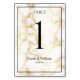 Un mármol con venas doradas y una tarjeta número de tabla boda de números negros que se puede personalizar con cualquier número de tabla. Los gráficos aparecen en ambos lados de esta tarjeta.