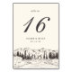 Las rústicas tarjetas de número de tabla de moda de bosques cuentan con un ilustracion esbozado de pinos de montaña, pinos y un río fluido, debajo de su número de tabla, fecha de evento y texto adicional de personalizado. El diseño se repite al revés. Coordina con nuestra suite de invitaciones a bodas de Mountain Sketch.