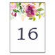 Las tarjetas con el número de la mesa son de flores de flores de jardín y cuentan con un borde superior de rosa acuarela y flores de peonía en tonos verdes de violeta violeta, rosa y verde rubor, con el número de la mesa en azul medianoche. El diseño se repite al revés. Coordina con nuestra suite de invitados a la boda Vibrant Bloom.