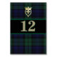Bonita tarjeta de mesa boda de lona escocesa, hecha en azul oscuro, verde y negro universal de Black Watch. Una banda negra de borde verde, en el medio, tiene números de negrita listos para personalizar para cada mesa en la recepción de tu boda. Gráficos de tono dorado de un símbolo de amor de Luckenbooth decoran la parte superior de la tarjeta de la mesa. Los productos de boda coincidentes están disponibles para su boda de Highland.
