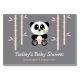 Una linda y kawaii bebé oso panda sostiene una sesión de bambú verde mientras se sienta alegremente en medio de un bosque de bambú rosa. Lleva un par de pañales rosados unidos por un pañal. Estas adorables TARJETAS rosa y gris para la ducha LIBRO REQUEST son perfectas para una panda o una ducha de bebé con temática asiática para que la nueva mamá espere una niña. Pintura © Chrissy H. Studios, LLC. Todos Los Derechos Reservados.