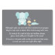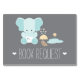 Un pequeño pájaro marrón sostiene un paraguas y se para dulcemente y pacientemente al lado de un pequeño elefante azul claro que lleva un par de pañales con un pañal azul sobre él. Estas tarjetas de solicitud de libros son perfectas para que la nueva madre espere un bebé. Pintura © Chrissy H. Studios, LLC. Todos Los Derechos Reservados.