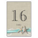 Burlap rústico y encaje con cinta acuática y diseño estampado de estepas, tarjeta número de mesa para complementar nuestro juego de invitación temática de playa, puede ser personalizado y ordenado individualmente. Diseño impreso, sin burlap, encaje o cinta adhesiva real.