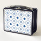 "Metal lunchbox with a navy blue frame and a geometric pattern on the sides. The pattern features white background with blue diamonds and intricate floral motifs."