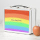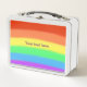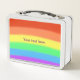 Las mezclas de arcoiris bonito, con una ligera curva, con un marcador de posición para el texto, se imprimen en las cajas de almuerzo metalizado personalizados. El cuadro de texto está centrado en el amarillo y está escrito en morado. El diseño está impreso en ambos lados. Gracias por comprar en CherylsArt en Zazzle.