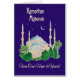 Una elegante tarjeta de felicitación de Ramadán 'De nuestro hogar a la tuya' con una mezquita iluminada por la luna en un fondo azul profundo, y 'Ramadhan Mubarak'; de una pintura de una acuarela de Judy Adamson.