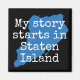 ¿Creciste en Staten Island? Este imán es para ti. Dice: Mi historia empieza en Staten Island. Leyenda blanca en el mapa azul de Staten Island New York. El color de fondo es negro. Entre las ciudades están: Tottenville South Beach Great Kills Port Richmond Prince's Bay Richmondtown Rosebank St. George Stapleton Todt Hill Eltingville Graniteville Grant City Grasmere Huguenot