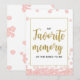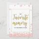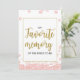 Esta moderna señaligen de lluvia de regalos "Mi recuerdo favorito de la novia" presenta un fondo floral rosa con salpicaduras de purpurina dorada. El texto está escrito en una mezcla de una fuente de caligrafía juguetona y una fuente moderna sin serif. Están disponibles tarjetas personalizadas de recuerdo favorito de la novia.
