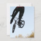 Fotografía de un motociclista BMX saltando alto en un cielo de color azul claro