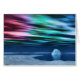 En la bahía de una tierra congelada flota un gran iceberg en el frío mar azul. Los copos de nieve y las estrellas mofan la escena, y en el cielo la aurora brilla en tonos rosas, lavanda, verde y azul.