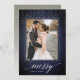 Elegante tarjeta de foto de vacaciones presenta un fondo azul de medianoche ricamente texturado, adornado con delicadas guirnaldas blancas en la parte superior. Añade tu foto vertical o vertical preferida orientada a retratos enmarcada por un borde blanco. "Merry" aparece en la parte inferior en letras de caligrafía blanca, con el nombre de tu familia oculto en el diseño. Personalice la parte de atrás con tres fotos adicionales y un saludo de Navidades personalizados.