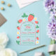 Hermosas bayas para esta transparente invitación de cumpleaños para niños. Un diseño bonito y dulce que presenta un patrón delicioso y juguetón de minifresas dispersas en un suave fondo azul cielo. Las fresas se representan en un rojo vibrante con hojas verdes, y se entremezclan con pequeñas y delicadas flores de fresa blancas o amarillas claras, que añaden encanto al conjunto. La impresión general es alegre, fresca y dulce. Todos los campos son personalizable.
