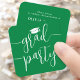 Estas invitaciones a la graduación son pequeñas en tamaño pero grandes en simplicidad elegante. Anuncie el logro del graduado e invite a la familia y amigos a celebrar con elegantes tarjetas de recinto verdes y blancas para la mini graduación. El tamaño de la pequeña tarjeta de visita cuadrada les hace fácil insertarla con los anuncios de graduación o entregarla a la familia y amigos (no vienen con sobres). Vendidos en paquetes a un precio asequible, estos insertos ofrecen una opción de moda para permanecer dentro de un presupuesto. La redacción de esta plantilla es sencilla de personalizar y los colores se pueden personalizar utilizando la herramienta de diseño Zazzle. El moderno diseño en blanco y verde incluye caligrafía manuscrita con un tapón de mortero y una elegante tipografía clásica. Esta tarjeta de invitación para graduación es una manera única de anunciar una celebración especial del día. ¡Felicitaciones al graduado!