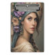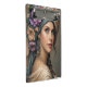 A captivating portrait of a woman with striking blue eyes, adorned with a lush floral headdress and draped in a richly patterned turban. Her gaze is serene, complemented by delicate flower-laden earrings and a soft, flowing garment, evoking a sense of romantic bohemian beauty.