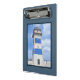 Diseño de temática náutica con decoración de faro acuático en un marco azul oscuro. Es posible cambiar el color de fondo y añadir uno diferente al diseño con su elección.