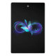 Símbolo infinito con mariposa mágica, morada brillante con alas transparentes, sobre fondo negro. Mariposa brillante.