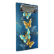 Composición de vuelo, joyería, oro y mariposas oscuras sobre fondo de joyería texturada. Mariposa dorada.