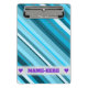 El diseño de este pequeño portapapeles presenta rayas de diferentes tonos azules, verde azulados o acuáticos, inspirados en los colores de las aguas de los océanos, mares, lagos y ríos. También incluye un nombre personalizado entre dos formas cardíacas en texto morado, dentro de un área de color gris claro y oscuro. [~Z0000237]
