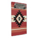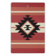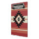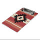 Patrón bohemio étnico azteca con formas geométricas en rojo, naranja, gris y negro sobre fondo rayado