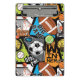A bold, energetic sports collage featuring basketball, football, soccer, tennis, and baseball elements with dynamic typography like “Big Game,” “Goal Time,” and “Winner,” set in bright, high-contrast colors.