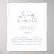 Esta señal conmemorativa minimalista de hoja azul en memoria es perfecta para una boda elegante. El diseño presenta una simple silueta de vegetación en azul pizarra claro con estilo minimalista clásico.