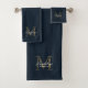 Minimalist Script Navy Blue Metallic Gold Monogram Bath Towel Set