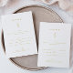 Elegante y simple hoja mínima oro y blanco de 5x7" Boda Carta de menú de mesa con menú de cena plano en caligrafía de escritura moderna. Puede encontrar una colección de artículos coincidentes y tamaño 4x9" en nuestra tienda VelvetPaperCo.