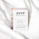 Presentando nuestra minimalista tarjeta RSVP de boda, una mezcla de encanto sobrio y elegante funcionalidad. La tarjeta capta la atención con su letra serif negrita y limpia, que explica 'RSVP' con una presencia dominante. A continuación, la fecha de vencimiento se escribe artísticamente en un guión elegante, añadiendo un toque de gracia y sofisticación. La parte trasera de la tarjeta ofrece una deliciosa sorpresa - un espacio para la foto elegida, haciendo de cada tarjeta de respuesta un recuerdo memorable de su día especial. Esta tarjeta no sólo simplifica el proceso de respuesta para sus invitados, sino que también lleva la esencia de su historia de amor, perfectamente encapsulada en un diseño moderno y minimalista.