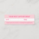 Una mini tarjeta profesional para un negocio de trenzado. Con la palabra "trenzas" en un estilo retro groovy. La parte delantera de la tarjeta incluye su nombre y detalles de contacto. La parte posterior de la tarjeta tiene espacio para que usted escriba la fecha y hora de la próxima cita de un cliente, junto con un recordatorio de su política de cancelación. Las plantillas de texto se pueden personalizar fácilmente.