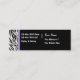 Diseño de tarjetas de visita de salón con elegantes rayas de cebra gráficas y moderno diseño de texto editable que puede personalizar en línea. ¡Usen estas tarjetas de visita para promocionarse y promocionarse de manera económica! Las mejores tarjetas de visita para temas relacionados con peluquería, salón de uñas, peluquería o salón de belleza. También se puede utilizar como tarjeta de negocios de moda o como tarjeta de presentación de diseño a la moda en un práctico formato de minitarjeta de visita.