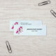 Mini tarjeta de visita con unicornio alado blanco con mané rosa, cola y pezuñas. El cuerno tiene anillos de color arcoiris y se parece a una golosina de caramelo. Este lindo unicornio está criándose en sus patas traseras. El corazón rosado dulce en la mejilla y las largas pestañas de una niña.