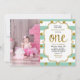 Las rayas verdes de menta y los puntos de polka purpurina oro aparecen en esta clásica invitación a la foto de primer cumpleaños del chica. Utilice el formulario de plantilla para agregar los detalles de su fiesta. La función Personalizar se puede utilizar para agregar texto a la parte posterior o cambiar el estilo de fuente.