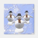 Cada muñeco de nieve lleva un gorra negro, dos ojos negros grandes, una nariz de zanahoria naranja y ramas delgadas para los labios. Una bufanda con estampado rojo y verde se envuelve alrededor de su cuello. Tres botones grises recorren su gran cuerpo circular. Los brazos están sobre la cara del muñeco de nieve, cada mano tiene cinco dígitos que cubren sus orejas, ojos o boca. Los copos de nieve caen sobre un helado fondo azul.