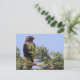 Esta postal muestra una fotografía de una estrella sentada en un abeto. El pájaro tiene un ojo morado y sus plumas brillan al atardecer. El hermoso cielo azul ofrece un entorno impresionante.
