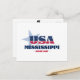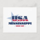 Postal de Mississippi. Un diseño tipográfico creativo que encapsula la esencia de Misisipi con colores rojo, blanco y azul audaces y elementos patrióticos, incluidas estrellas y rayas.