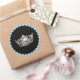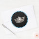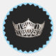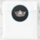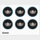 El pegatina redondo se muestra con fondo negro con una imagen de la corona de aspecto plateado. Tiene un toque de color con un borde azul cielo. Se muestra un gran tamaño. Cambie el color del borde si lo desea. Personalizar o compra como está.
