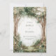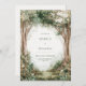 This design features a tranquil, overcast forest scene filled with a sense of quiet mystery. Towering, textured trees with delicate white blossom reach toward a misty, fog-shrouded background, creating a deep and immersive woodland atmosphere. The lush greenery of the forest floor is rendered in soft, painterly tones, all encased within a crisp, double-line gold frame that adds a touch of modern sophistication to the organic scenery. As a wedding invitation, this piece is an ideal choice for a moody woodland ceremony, a refined outdoor spring wedding, or a whimsical fairy-tale celebration. It sets a peaceful and romantic tone, focusing on the natural beauty and enchanting stillness of a hidden forest grove.