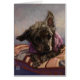 Mezcla adorable y pequeña mezcla de caniche pintada por Traci Van Wagoner poniendo un bronceado y una almohada roja con una oreja encaramada en la cabeza.
