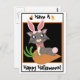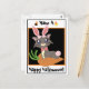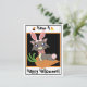 Misty es un gato personalizado gris con un adorable traje de conejo rosa, con orejas y cola de conejo. Ella está sentada en un cojín de zanahoria. ¡Truco o trato! El fondo puede ser de cualquier color.
