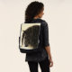 Caballo friesio negro con una larga melena ondulada que muestra los cálidos realces amarillos de la tarde del sol. Obra de arte realista creada a partir de una pintura al óleo original del artista de la fauna y la flora silvestres Crista S. Forest.