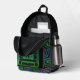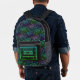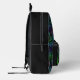Una mochila con un patrón de cassette neón multicolor. Incluye cintas de audio con colores rosa, azul, violeta y verde en el fondo negro