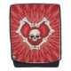 Esta mochila de Cara Negra con una cara frontal intercambiable es roja con líneas de araña abstractas blancas y un corazón rojo gótico delineado en huesos blancos con un cráneo en el centro.